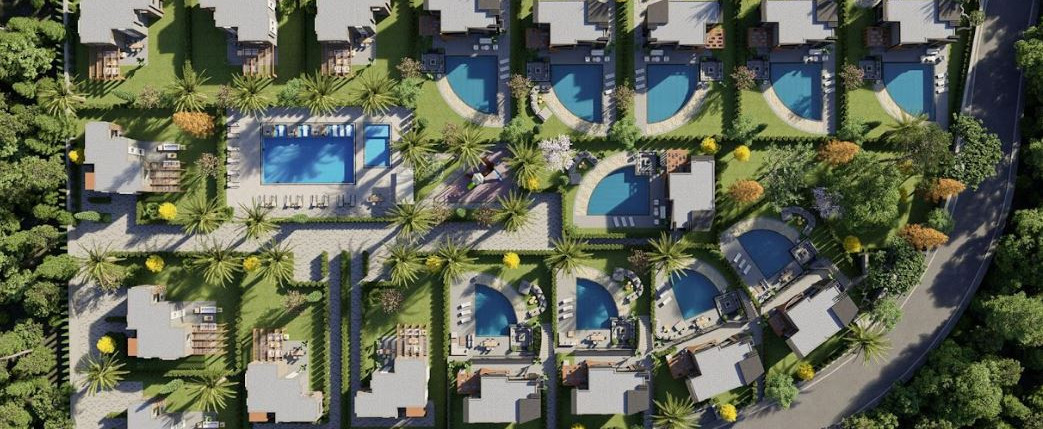 Villas en venta en Bodrum, Türkiye a precios adecuados para obtener la ciudadanía turca. Cada villa tiene una piscina privada y su propio espacio verde. El proyecto también incluye departamentos de diferentes modelos. Está a minutos de la costa.
